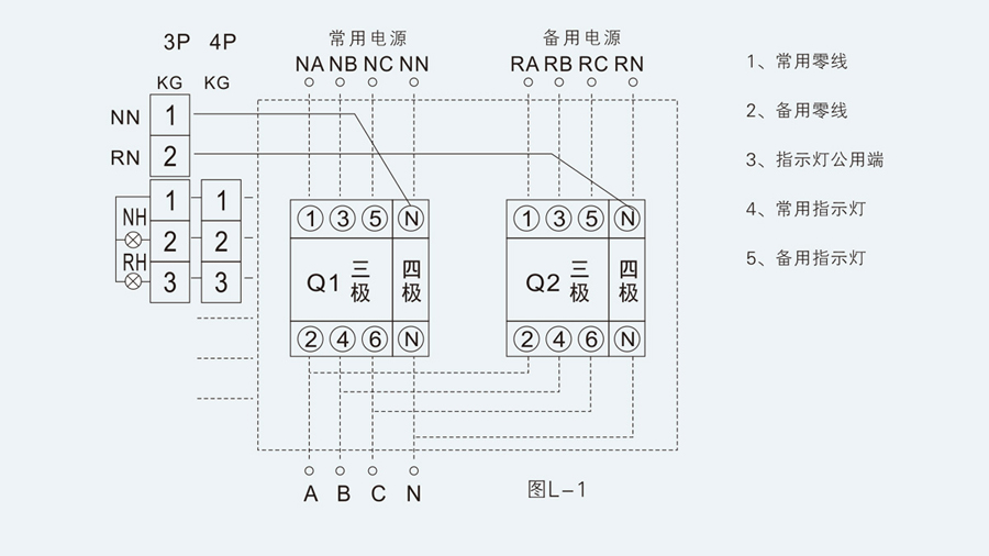 若選用斷路器為三極斷路器,則必須將常用電源(N)的零線NN和備用電源(R)的零線NR同時接到三極專用接零線端子KG上。具體操作 見接線圖。雙電源切換開關自動控制器的工作電源取斷取斷路QN和QR的進線端A相和零線N,若選用斷路器為三極斷路器時,必須要接零線NN 和NR,該三極專用接線零端子在兩臺斷路器中間,在自動電源切換開關安裝,接線過程中,切不要把原接在斷路器進線端的本機控制器線忘掉, 碰斷或短路等。